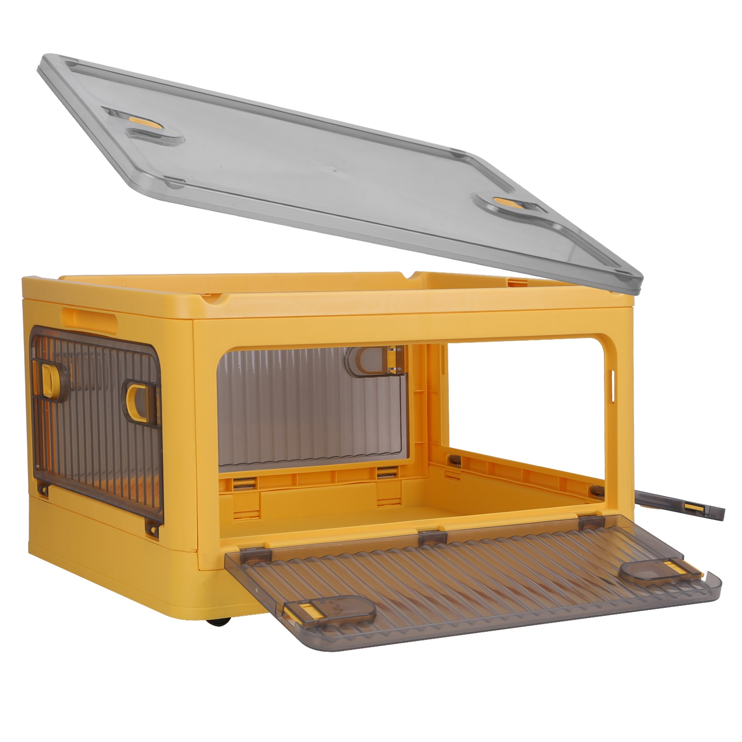 No need tools needed, just take 10s to set up. This free standing storage container with lids and doors is a must have for your house. It can stack together steadily to save space. Store things in a sufficient way by opening the lid, and take out things by opening 4 side doors. Safety lock on the doors ensure no falling of your items when moving the bin. Side handles and 4Pcs bottom wheels bring you much convenience when moving. Great to place it in bathroom, kids room, kitchen, etc. to hold snacks, wine, drinks, toys and more. 70QT/31QT, white/yellow storage bin can be selected according to your needs.