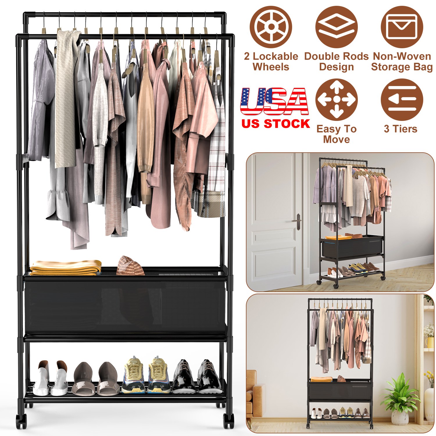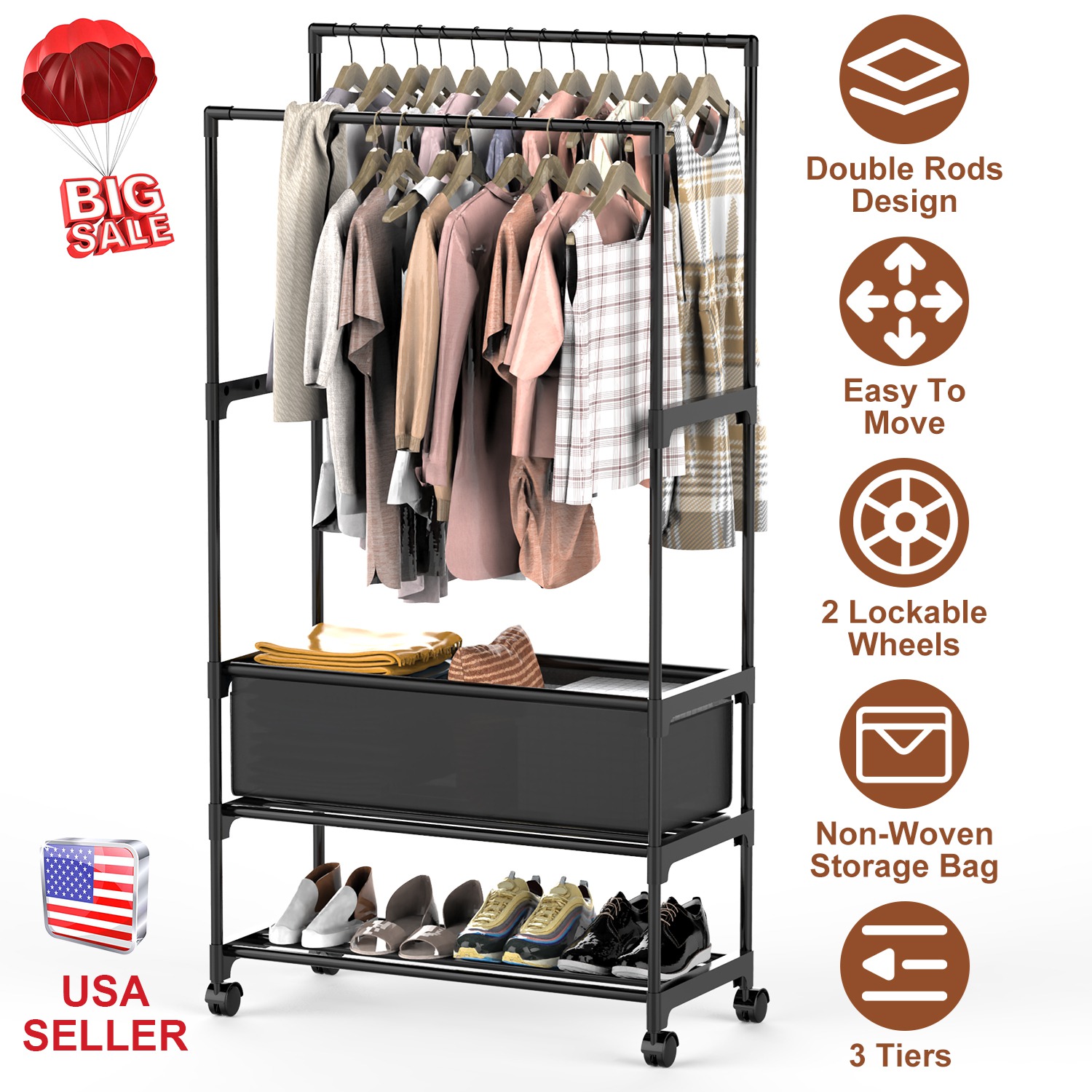 Double Rods Garment Rack with Storage Bag Portable Clothing Rack with Shelves Lockable Wheels Small Portable Closet Storage Bag Height Adjustable